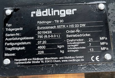 Rädlinger Tiltmotor 790, Klasse 6-8 To., Direktaufnahme passend zu Eurocomach 65TR, ohne Fanghakensystem, mit Rädlinger Schnellwechsler HS08 DW, Fabrikneu, mit Fertigungsdatum 07.2020, war noch nie im Einsatz. Selbstabholung ab Standort Kassel. Irrtümer und Zwischenverkauf vorbehalten.